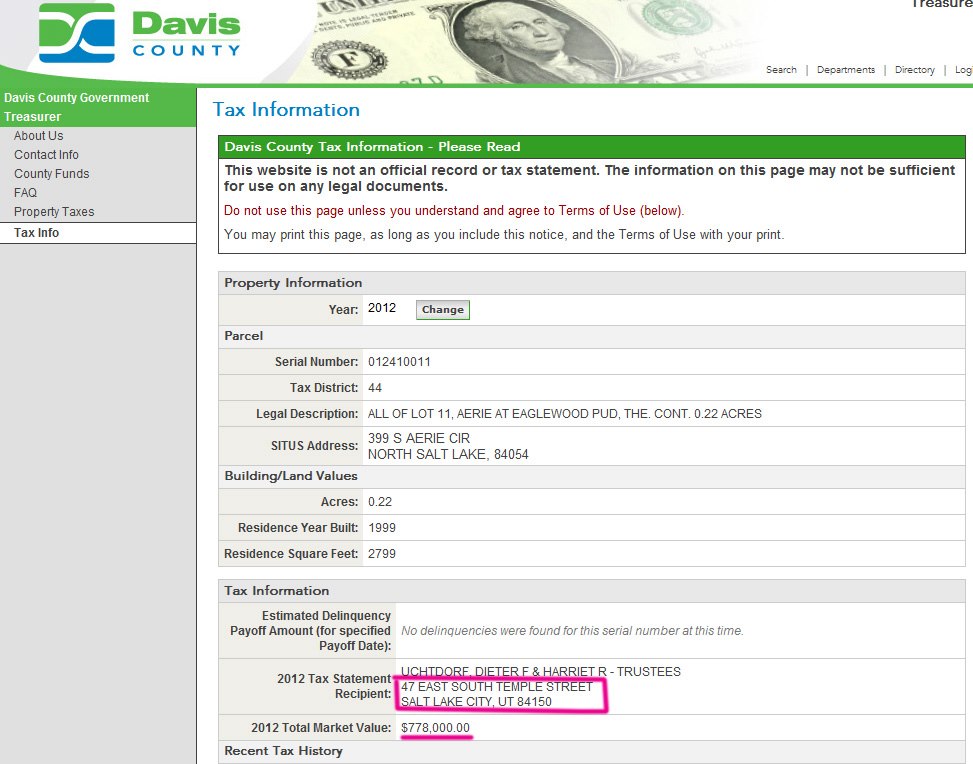 What we see is, Hero Dieter owns two homes worth three-quarters of a million each. Hero Dieter, who quit his aviator position at Lufthansa in 1996 hasn't worked a job in 16 years, but bought two homes with combine worth today of $1.5M. The latest, last year, in the development where the LDS church already bought homestead plots bigger than Dieters.