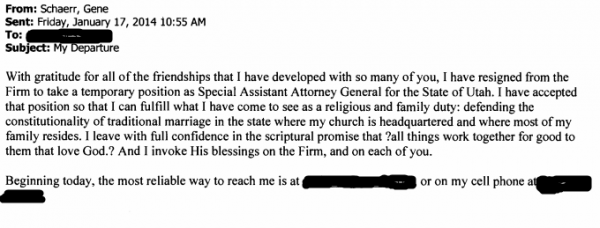 According to an email circulated online Wednesday, Schaerr told co-workers at the Washington, D.C., law firm Winston and Strawn that he was resigning to "fulfill what I have come to see as a religious and family duty: defending constitutionality of traditional marriage in the state where my church is headquartered and where most of my family resides."