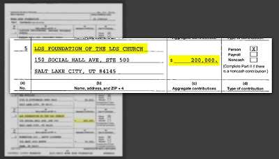 However, Futuremissionary (http://futuremissionary.com/) reports that their tax returns tell a different story (http://futuremissionary.com/more-good...). Apparently, Futuremissionary has found that ''starting in 2009, there were also yearly donations of between $100,000 and $200,000 from “LDS Foundation of the LDS Church.” Over 3 years, donations from this foundation totaled $450,000.''