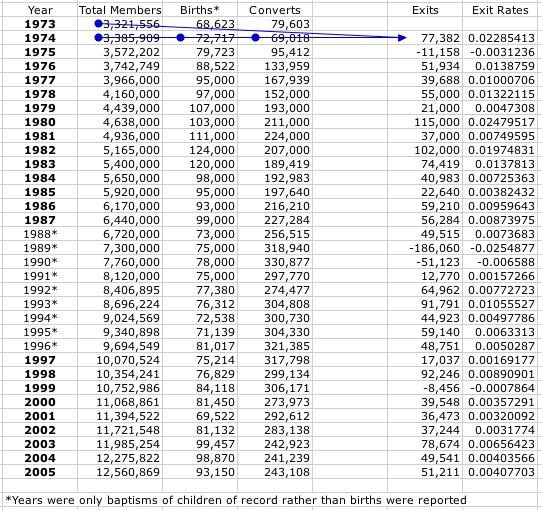 "For instance, in 1973 the Mormon Church membership was reported to have increased to 3,306,658 from 3,218,908 the previous year--a difference of 87,750 members. But the Church also reported that they had baptized 80,128 new converts and 52,789 8-year-olds (totaling 132,917)--or over 150% of the membership increase that year. That leaves 45,167 members unaccounted for. When looking again at the graph Year-Over-Year Change in Membership, we see that 1973 is the lowest year for increase in membership--the only year lower than 100,000.