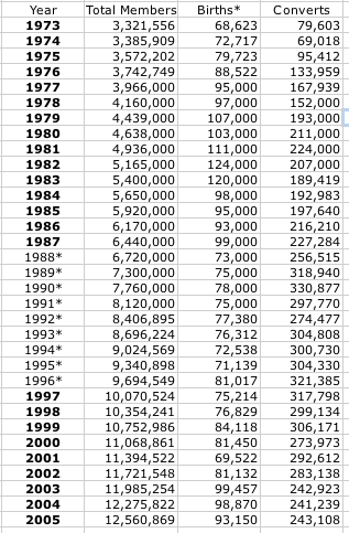 "Each year, the number is positive--meaning that each year there are more Mormons than the year before (at least since 1970) and we know how many more there are. We also have conversion and children of record statistics so we can readily compare conversion details to membership numbers as a whole.
