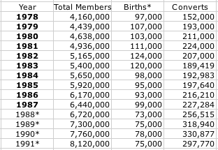 "Even stranger are years like 1989--when the total number of baptisms falls short of the Mormon Church membership increase for that year. The LDS Church shows a membership increase of 587,234 in 1989 but there were only 318,940 convert baptisms and 75,000 8-year-old baptisms--meaning that 193,294 members were added to the membership total that weren't baptized.